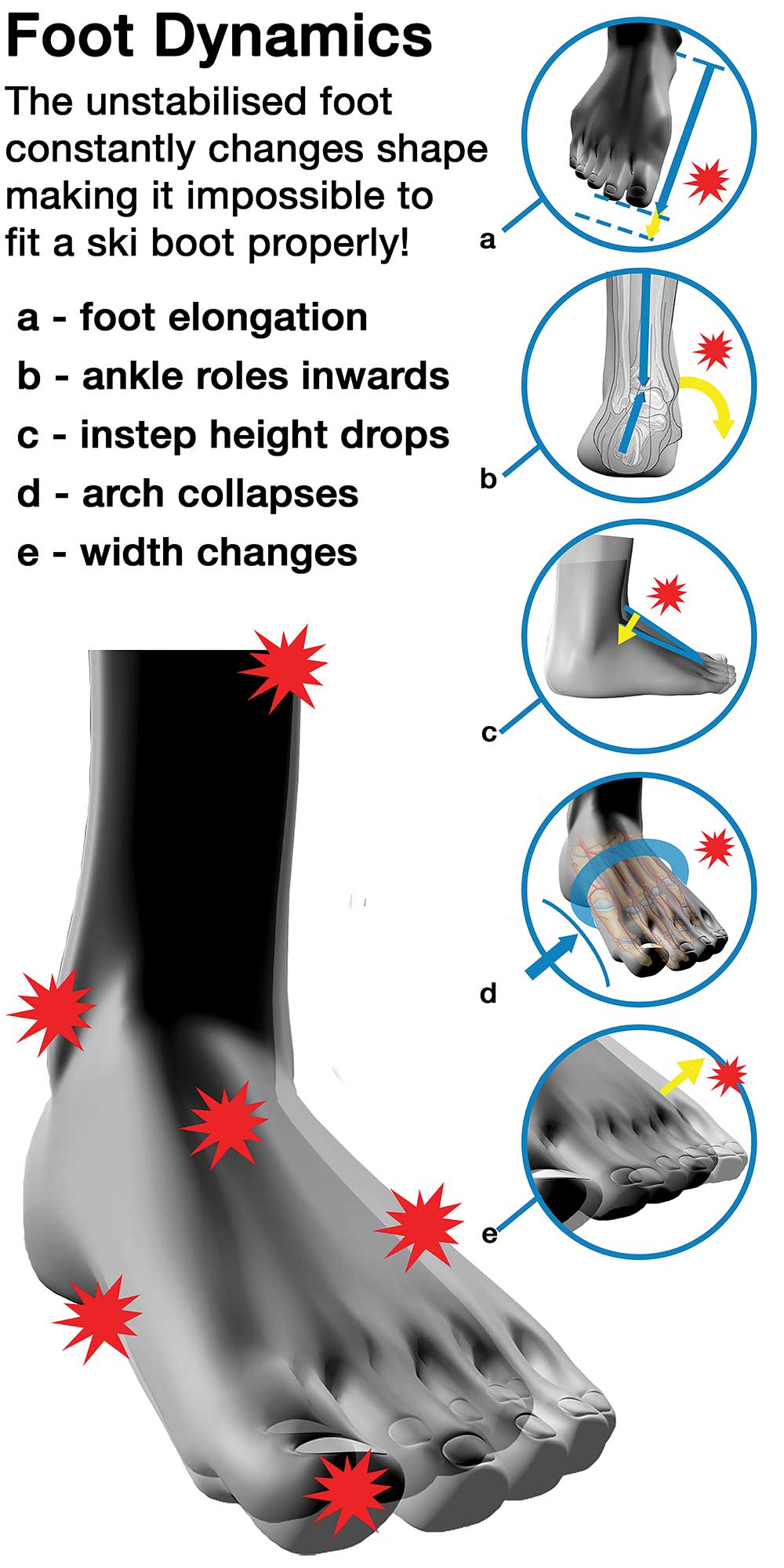 Skier orthotics support and stabilise your feet inside your boots, limiting the dynamic behavior – shape, length, height, volume change – and allowing us to choose a shell shape and length that closely resembles that of your foot ie a shell that is not 2 sizes to big!