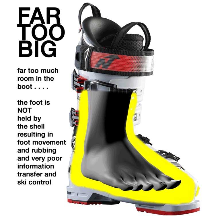 Often they will feel comfortable at the time of fitting (of course, your feet are not even touching the sides!) but once you start skiing your foot moves around, and your heel lifts offering no control over the ski, and you MAKE NO PROGRESS!