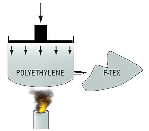 Extruded p’tex is made by heating up a batch of p’tex and then forcing the liquid mass through a hole, the resulting mass is then rolled out and flattened. This results in a low molecular weight - open cell, soft p’tex that is easy to wax but loses its wax quickly therefore dries out and furs up meaning the skis are slow and sticky. Bases are also soft and are prone to easy damage.